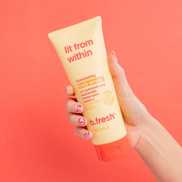 is your skin a lil drab? let's get lit! give your skin the bright future it deserves with this illuminating body serum. we've got skin loving ingredients hyaluronic acid, niacinamide, licorice root + vitamin c all out here to transform that drab skin & get lit. the skin-brightening & antioxidant rich blend works to reduce inflammation & redness; soothe uneven texture & tone; protect skin from environmental damage and help treat hyperpigmentation for illuminated, glowy skin. so, the gang's all here, let's get lit!
