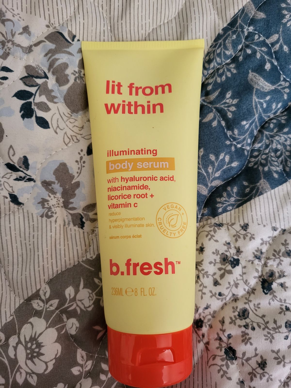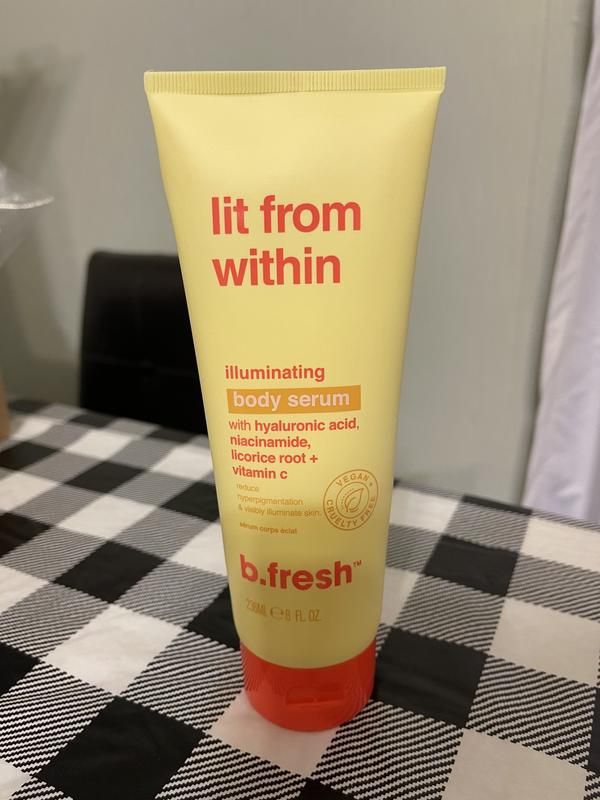 give your skin the bright future it deserves with this illuminating body serum. we've got skin loving ingredients hyaluronic acid, niacinamide, licorice root + vitamin c all out here to transform that drab skin & get lit. the skin-brightening & antioxidant rich blend works to reduce inflammation & redness; soothe uneven texture & tone; protect skin from environmental damage and help treat hyperpigmentation for illuminated, glowy skin. so, the gang's all here, let's get lit!